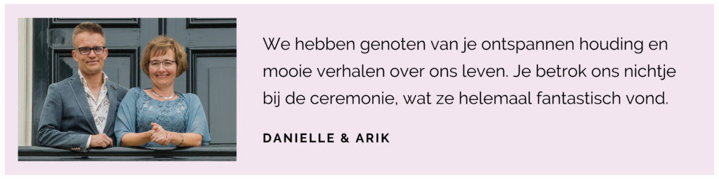 Ik maak van de huwelijksceremonie een echt feestje, samen met jullie. Ik vertel jullie persoonlijke verhaal met een grote glimlach, enthousiasme en ruimte voor interactie. Kinderen, getuigen, vrienden, familie; iedereen krijgt een plekje in de ceremonie. Humor, anekdotes en emotie zijn de rode draad.