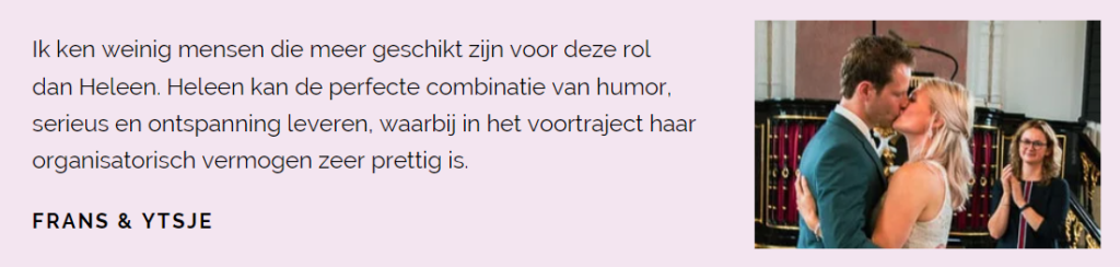 Ik werk voor de gemeente Weststellingwerf. Wil je hier trouwen, dan kun je dit direct regelen met de gemeente. Maar ik mag ook huwelijken sluiten op andere plekken in Nederland. Schroom niet. Laten we samen bekijken wat jullie wensen zijn. Liever de grens over? Tof! Ik reis graag met jullie mee.